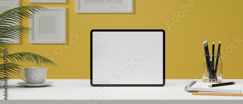 Obraz premium creative workspace in yellow wall, empty tablet screen with stationery on white table
