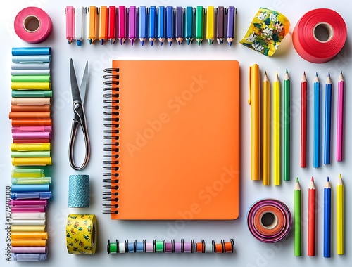 Obraz premium Creative Workspace with Orange Notebook, Colorful Pencils, Markers and Tape...