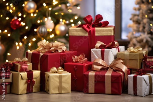 © altitudevisual, Obraz premium creatively wrapped gift boxes surrounded by holiday decorations