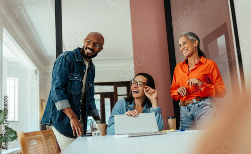 © (JLco) Julia Amaral, Fototapeta premium Creatives and freelancers collaborating in a modern, colorful office boardroom