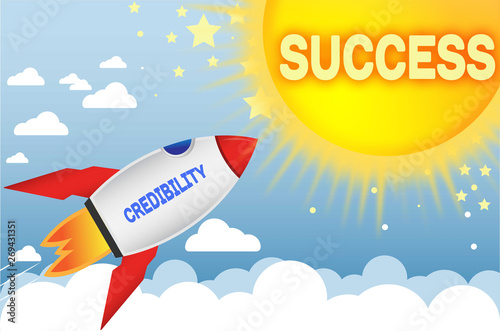 Naklejka premium Credibility connects to success in business,work and life - symbolized by a cartoon style funny drawing with blue sky, yellow sun and red rocket, 3d illustration