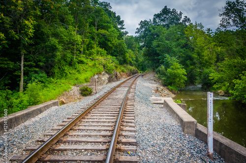 Fototapeta premium Creek and railroad track in rural Carroll County, Maryland.