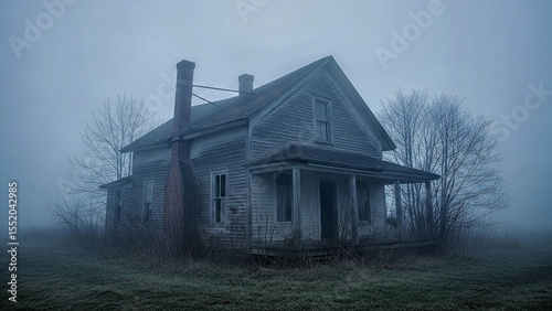 Obraz premium Creepy abandoned house enveloped in thick fog, nestled within a rural...