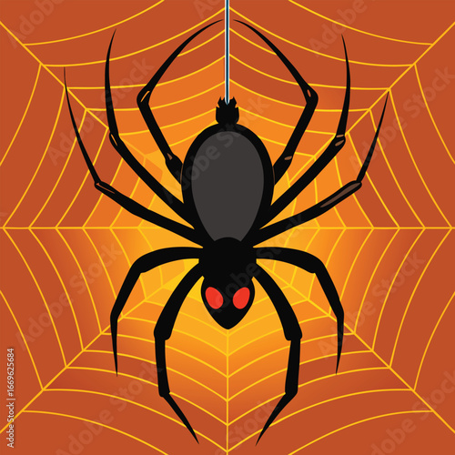 Obraz premium Creepy black widow spider suspended in its eerie orange web ready for halloween