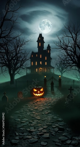 © BAHRUL ULUM, Fototapeta premium creepy cemetery with old tombstones and glowing pumpkin