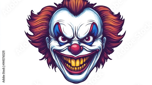 © Falih, Fototapeta premium Creepy Clown Face with Fiery Hair and Sinister Smile for Halloween Themes