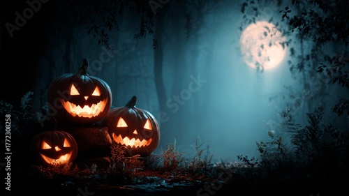 Naklejka premium Creepy glowing jack o lantern pumpkins on a dark night with full moon in mystical haunted forest, spooky halloween background with eerie atmosphere and autumn vibes