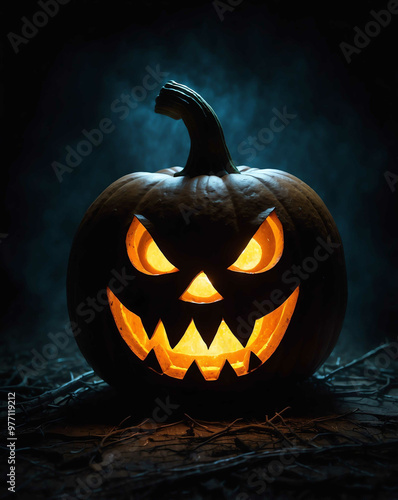 Naklejka premium Creepy jack o lantern glowing in darkness