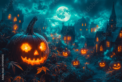 Fototapeta premium Creepy jack o lantern glows on the street in the dark of halloween night