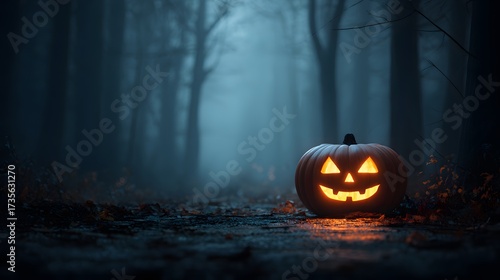 © Allakulyevva, Naklejka premium Creepy jack-o’-lantern on the ground in darkness. Glowing Halloween pumpkin in the misty woods