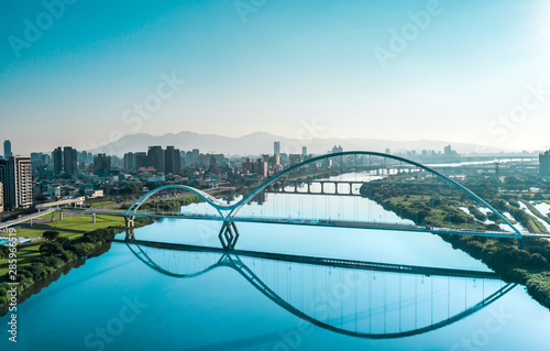 © yaophotograph, Obraz premium Crescent Bridge - landmark of New Taipei, Taiwan with beautiful