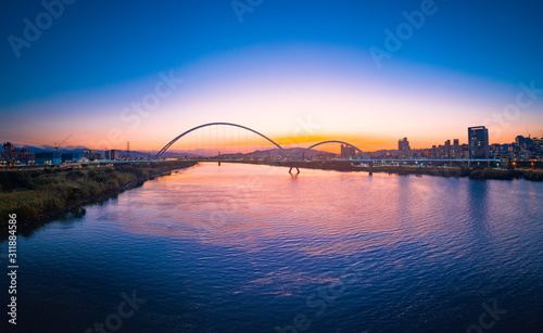 © yaophotograph, Fototapeta premium Crescent Bridge - landmark of New Taipei, Taiwan with beautiful illumination at day, aerial photography in New Taipei, Taiwan.