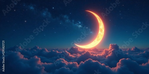 © Bh_19, Fototapeta premium Crescent Moon above a Sea of Clouds at Night with a Starry Sky