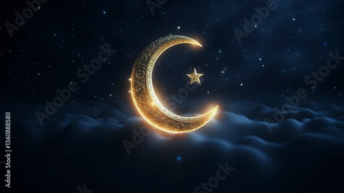 © Magic Stock, Fototapeta premium Crescent moon and star with lights on dark blue background, Ramadan concept.