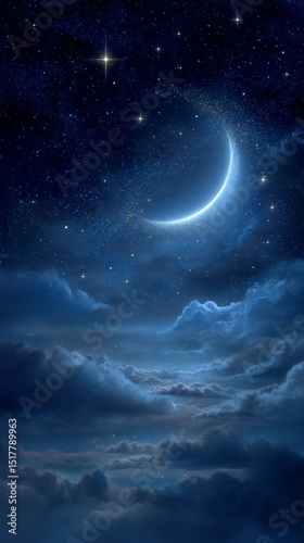 © Rayyan, Fototapeta premium Crescent Moon and Starry Night Sky Over Dark Blue Clouds