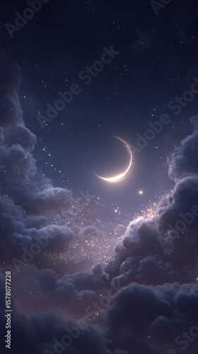 Obraz premium Crescent Moon and Starry Night Sky with Purple Clouds