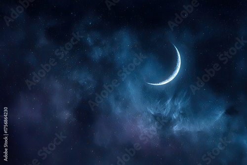 Fototapeta premium Crescent moon glows softly, surrounded by atmospheric clouds and a dark, star-filled sky