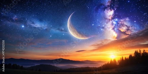 Fototapeta premium Crescent moon glows with a soft, ethereal light in a star-spangled twilight...