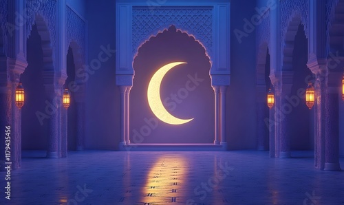 Fototapeta premium Crescent moon in ornate archway of Islamic architecture.