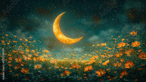 © Fiva, Fototapeta premium Crescent moon over a field of orange cosmos flowers at night