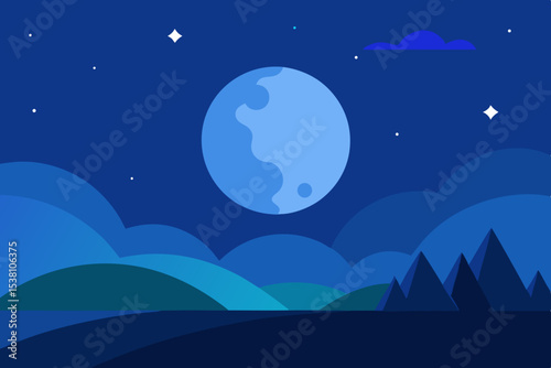 © Rashada, Fototapeta premium Crescent moon over blue mountains night landscape