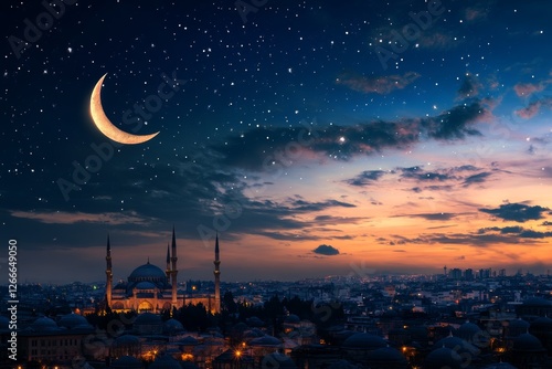 © abdul, Fototapeta premium Crescent moon over city mosque at twilight