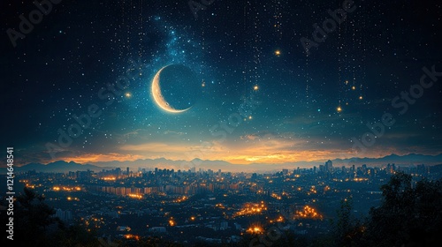 © Kang, Naklejka premium Crescent Moon over Glowing City at Night with a Starry Sky