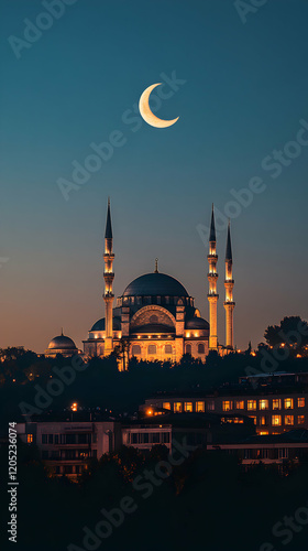 © Gustav, Fototapeta premium Crescent Moon over Illuminated Mosque at Night