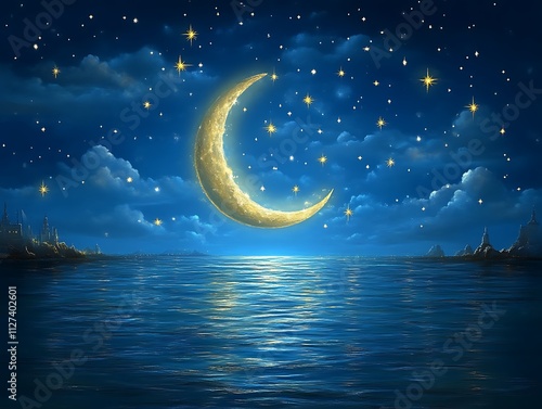 © Juplek, Fototapeta premium Crescent Moon Over Ocean Cityscape Night Stars