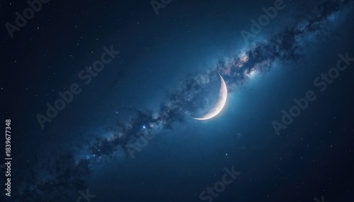 © Viktor, Fototapeta premium Crescent moon shines in dark blue night sky. Stars adorn night landscape. Milky Way illuminates heaven. Celestial scene evokes romantic, fantasy moods. Space exploration theme. Abstract art for