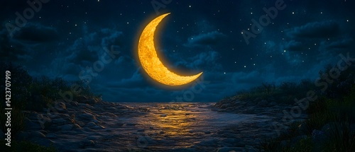 © Faustudio, Fototapeta premium Crescent moon shines over a desert.
