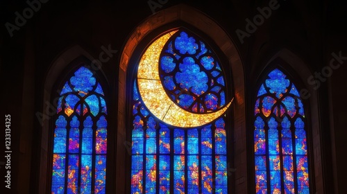 © Riz, Obraz premium Crescent Moon Stained Glass Window in Church at Night