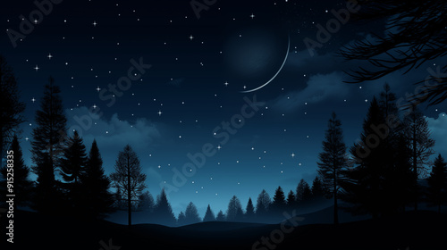 Naklejka premium Crescent Moonlit Starry Night Sky with Dense Pine Forest and Silhouetted Trees in a Quiet Wilderness Scene
