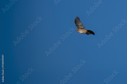 © Agustin, Fototapeta premium Crested lark in flight with clear blue sky