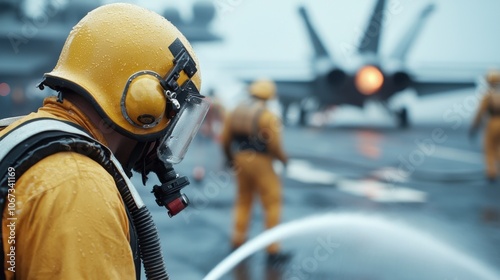 © Aniwat, Naklejka premium Crew Members on an Aircraft Carrier Under Rainy Conditions