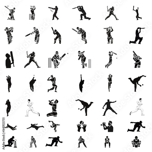 © Muftadil Islam, Naklejka premium Cricket player, batsman, bowler, wicketkeeper, fielder silhouette vector illustration of a cricket match in cricket sport and cricket game 42 vector editable file for cricket tournament, championship.