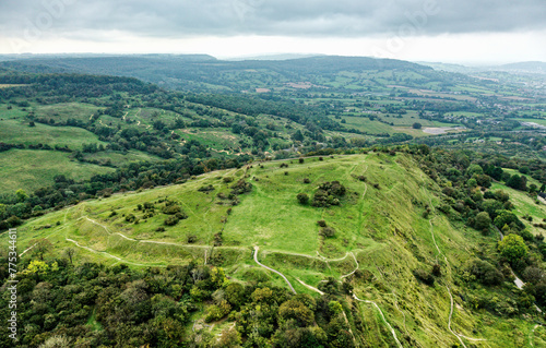 © David Matthew Lyons, Fototapeta premium Crickley Hill causewayed camp and hillfort 4000 year occupation site from Neolithic to post Roman. Cotswold Hills, Gloucestershire, UK. Aerial view SW