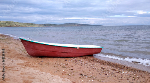 Fototapeta premium Crimea. Kerch Peninsula. Red boat on the shore of the Azov Sea.