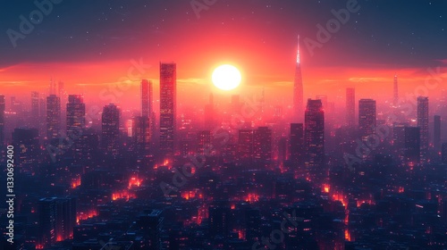 © atul _art, Fototapeta premium Crimson Cityscape: A Futuristic Metropolis at Sunset