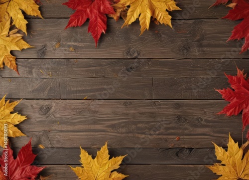 © Narawon, Obraz premium Crimson & gold maple leaves scattered on rustic wood grain , season, red