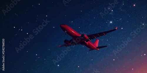 Naklejka premium Crimson Jet Ascending Through a Starry Night Sky, A Celestial Voyage of Air Travel