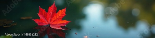 © Withun, Naklejka premium Crimson red maple leaf floating on a still pond surface, crimson, serenity, pond
