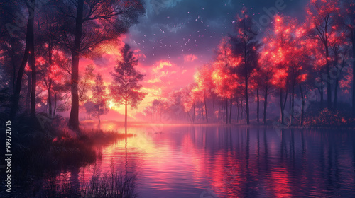 © king of blade, Obraz premium Crimson Sky Forest: A magical forest bathed in the ethereal glow of a crimson sunset, the water reflecting the vibrant hues, creating a breathtaking spectacle of nature's artistry.