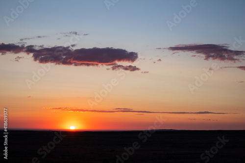 Naklejka premium Crimson summer sunset that dramatically highlights clouds in Kazakh steppe.