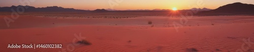 Obraz premium Crimson sun dips below horizon, casting long shadows across the tranquil desert floor , wild, peace, tranquility
