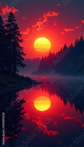 Fototapeta premium Crimson sunset fire, forest mirrored in still lake , eventide, green, twilight