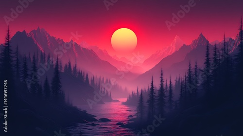© Diki prayoga, Fototapeta premium Crimson twilight over a mountain river