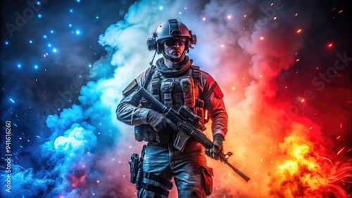 © Four888, Naklejka premium CrimsonCourage: Bravery, Sacrifice, Aftermath, Red and blue lights, Smoke
