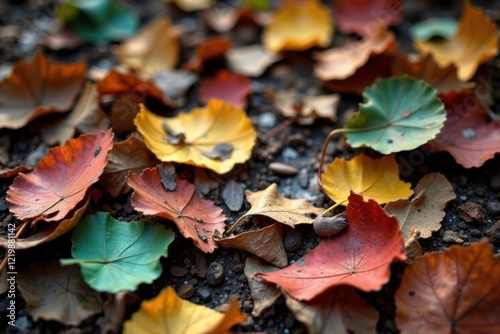 © beng, Obraz premium crinkled paper scraps scattered on forest floor, texture, decay, leaves