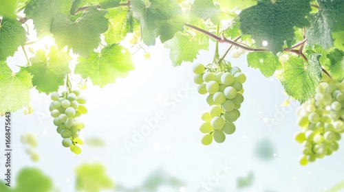 Naklejka premium Crisp and vibrant green grapes on the vine, detailed with healthy leaves,...
